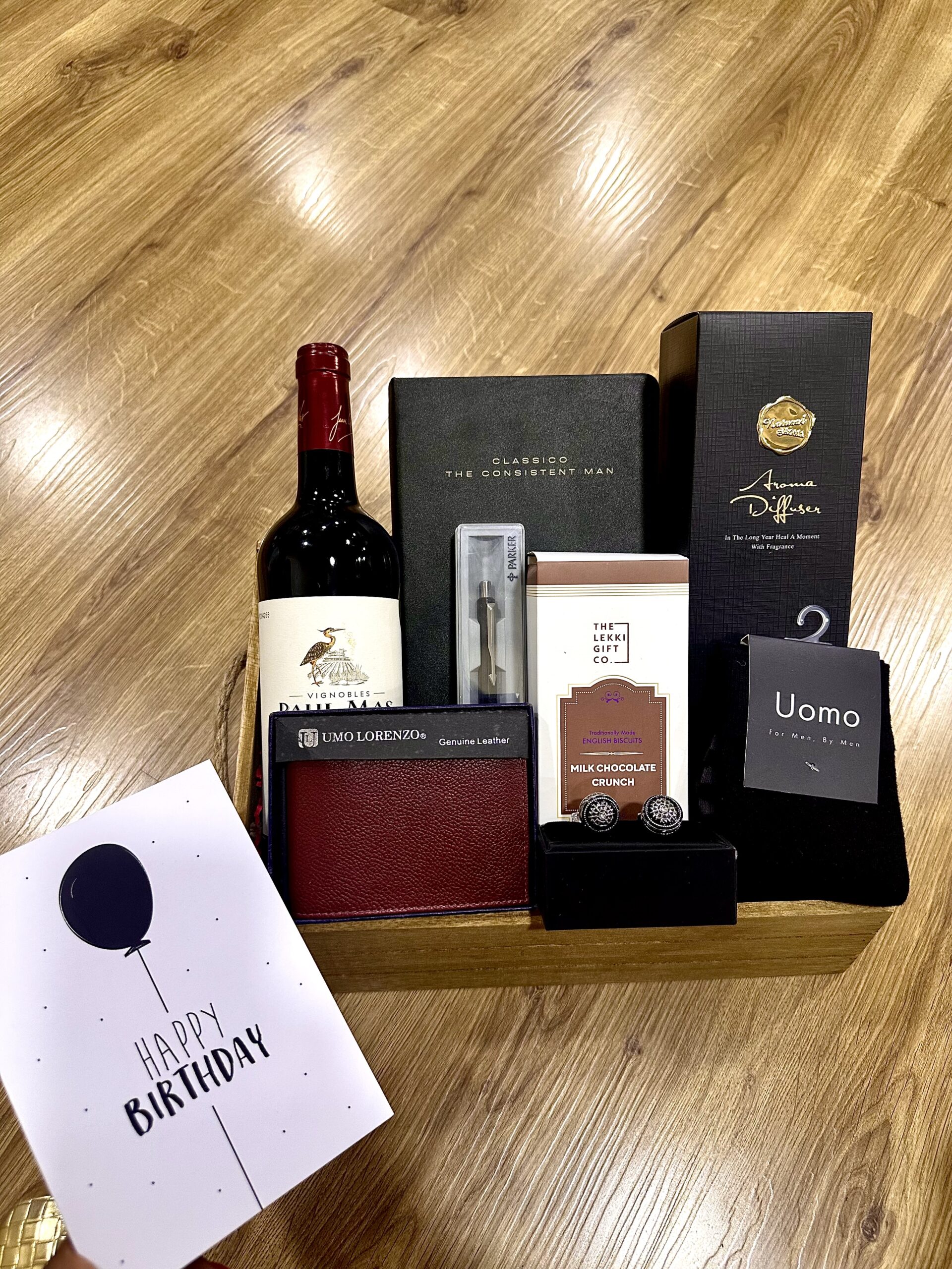 A birthday gift for him that speaks of style, intention, and quiet indulgence. Thoughtfully curated with elevated essentials — from fine wine to refined accessories — this box is designed for the man who appreciates the details.