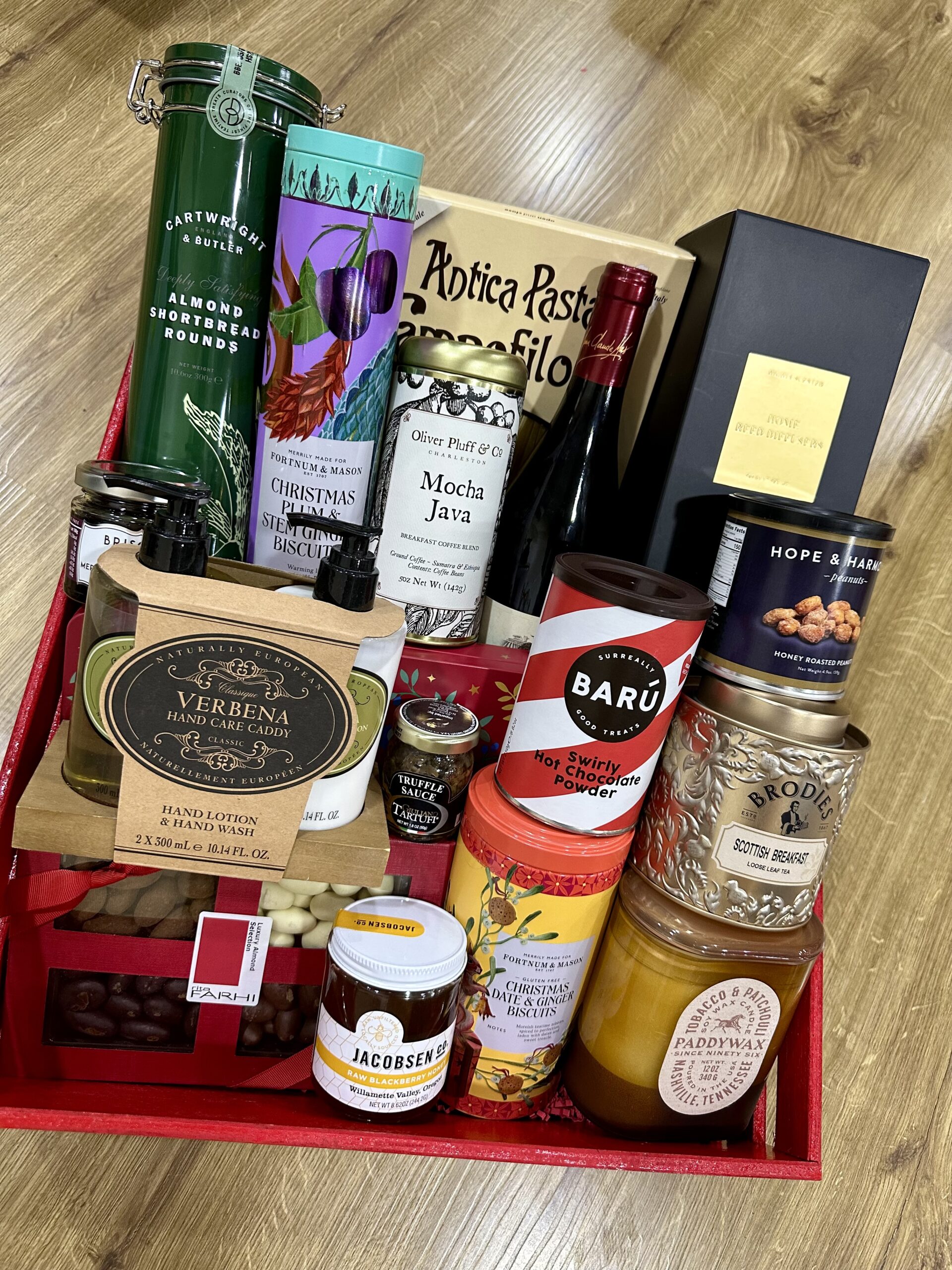 An abundant and elegant celebration of flavor, comfort, and craftsmanship, The Grand Holiday Gourmet Collection is designed for those who appreciate the finer things. This premium hamper blends festive sweets, artisan pantry staples, comforting teas and coffees, indulgent chocolate, fine wine, and a touch of luxury self-care. Perfect for Christmas gifting, milestone celebrations, or impressive corporate presents, it delivers warmth, indulgence, and seasonal joy in every layer.